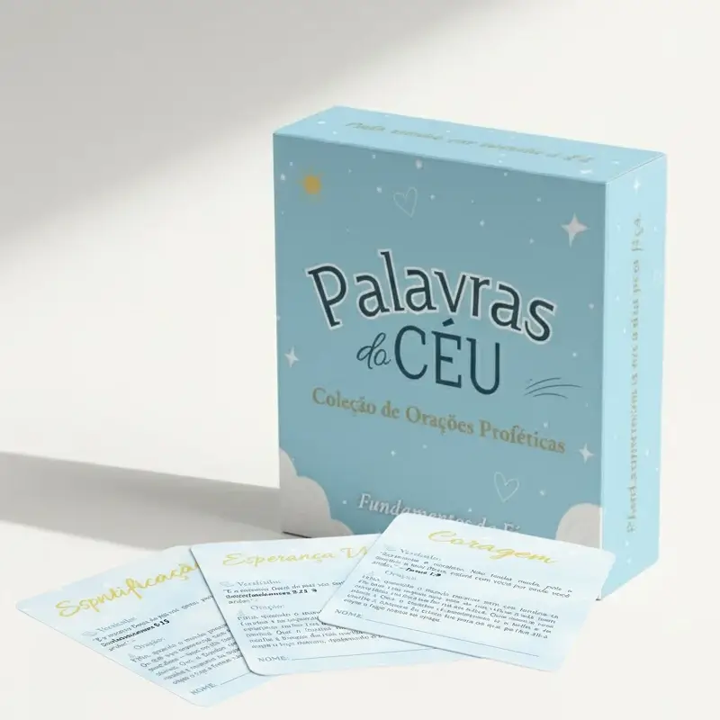 Box Palavras do Céu é o seu refúgio diário em meio à correria. Mais que mensagens, ela oferece declarações escritas com oração para realinhar sua alma e fortalecer sua fé. Abra, declare e viva palavras de poder que trazem calma e intencionalidade à sua rotina. Um presente com propósito, feito para quem busca conectar o céu ao centro do dia a dia.