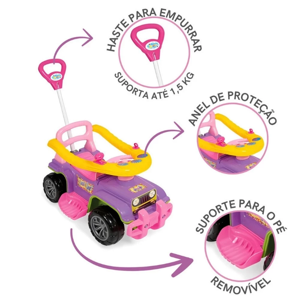 Modo Pedal: Quando o pequeno aventureiro crescer, é só retirar os acessórios e deixá-lo assumir o volante! É a hora perfeita para fortalecer as perninhas e treinar a coordenação motora.